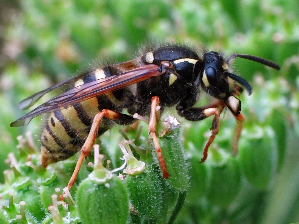 Kaum hat die Taillenwespe den Zweiflügler erspäht, macht sie sich zielsicher an die Verfolgung. Die Jagd währt nicht lang und der gelb-schwarze Räuber bohrt seinen Hinterleibsstachel in die Beute. Anders als die Bienenverwandschaft verenden Wespen nach dem Stich nicht, denn ihr Stachel ist nicht mit Widerhaken bewehrt, sodass er wieder eingezogen und mehrfach verwendet werden kann.