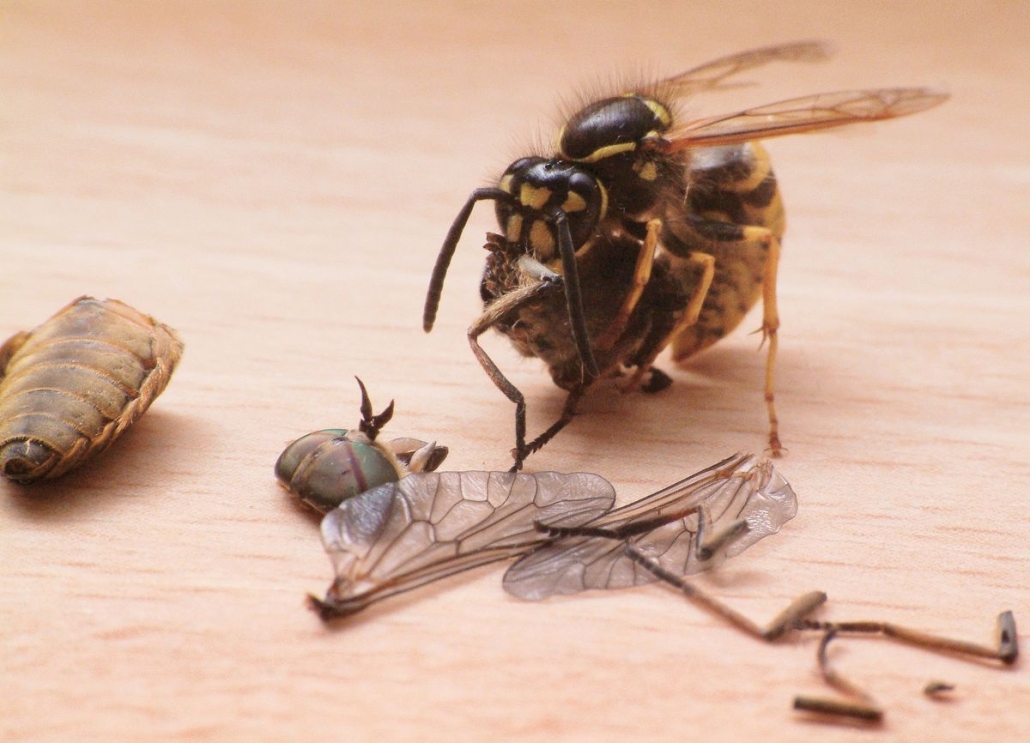 Mit ihren kräftigen Mundwerkzeugen trennt die Wespe zunächst die beiden Flügel vom Rumpf und entfernt eins nach dem anderen die sechs Beine. Wäre die Fliege nicht ohnehine schon paralysiert, spätestens jetzt wäre kein Entkommen mehr möglich. Das Raubinsekt dreht und wendet den Körper seines Opfers zwischen den Tarsen, die scharfen Mundwerkzeuge schließen sich oberhalb der Brust und der Bremsenkopf mit seinen riesigen grünen Facettenaugen fällt herab. Einige Bisse später ist auch der Hinterleib – der Biologe nennt ihn auch Abdomen – entfernt. Die Wespe weiß, dass der Thorax die nahrhaftesten Stücke ihrer Jagdbeute enthält: Hier sitzt der kräftige Muskelmotor, der die Insektenflügel in Bewegung setzt. Und tatsächlich packt der wehrhafte Hautflügler am Ende nur die proteinreiche Bremsenbrust und fliegt damit, die wertlosen Reste der ausgeweideten Fliege achtlos zurücklassend, zur Türe hinaus.